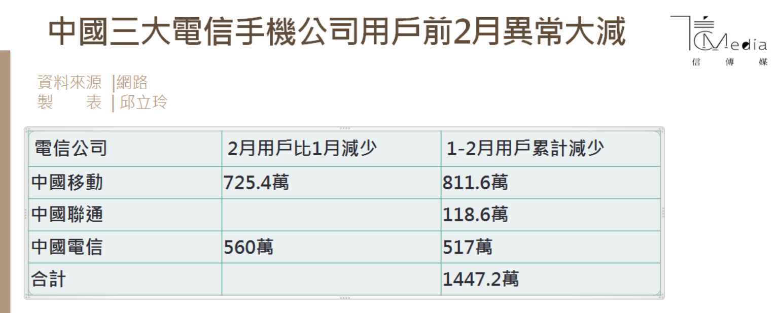 20年來首見!中國手機用戶今年前2月異常大減1447萬有什麼隱情? - 信傳媒